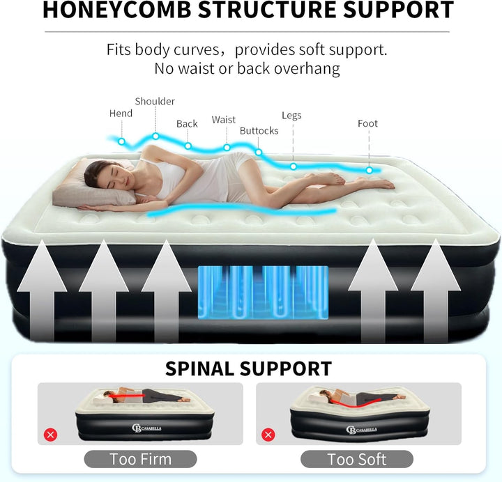 · Experience bed-like comfort with internal air coils. This advanced system evenly distributes weight, eliminates sagging, & provides full-body support for two adults, ensuring you both wake up feeling refreshed & ache-free.