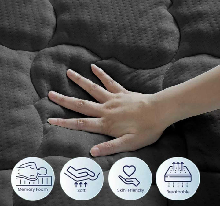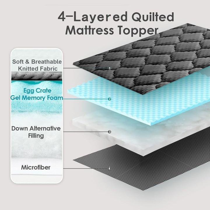 Experience the perfect blend of luxury and support with our Premium 4-Layer Gel Memory Foam Mattress Topper, designed to transform your sleep into a cool, pressure-relieving retreat. The advanced 4-layer construction combines cooling gel-infused memory foam with high-density support foam to deliver optimal comfort and spinal alignment. The temperature-regulating gel actively dissipates body heat, keeping you comfortably cool throughout the night, while the responsive memory foam contours to your body’s natural curves, relieving pressure on key areas like hips, shoulders, and back. Whether you sleep on your side, back, or stomach, this topper adapts to your position, minimizing motion transfer for undisturbed rest. Indulge in hotel-quality comfort with a plush, breathable cover that enhances airflow for a fresh, sweat-free sleep environment. The quilted surface adds a soft, cloud-like feel, elevating your bed to 5-star luxury. Designed for practicality, the extra-deep 35cm (14") pocket fit ensures a secure stay on thick mattresses, thanks to its deep elasticated skirt and anti-slip grip that prevents shifting. Maintenance is effortless with a machine-washable cover, while the hypoallergenic and dust-mite-resistant materials promote a healthier sleep environment. Upgrade your sleep with this premium gel memory foam topper—where advanced support meets cooling comfort for rejuvenating rest every night.